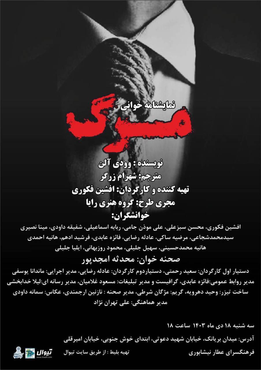 به گزارش جام جم آنلاین به نقل ازروابط عمومی مراکز فرهنگی هنری منطقه ده، نمایشنامهخوانی «مرگ» به نویسندگی وودی آلن، با ترجمه ای از شهرام زرگر و به کارگردانی افشین فکوری روز سهشنبه ۱۸ دیماه، ساعت ۱۸ در فرهنگسرای عطار نیشابوری اجرا میشود.