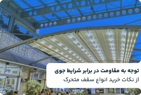 سقف متحرک باید در برابر شرایط جوی مختلف مانند بادهای شدید، بارانهای سنگین، برف و اشعه UV خورشید مقاوم باشد. برای مناطق با آب و هوای سخت، سقفهایی با استانداردهای مقاومت بالا (مانند استاندارد IP برای مقاومت در برابر آب و گردوغبار) انتخاب کنید. همچنین، بررسی کنید که سقف در برابر دماهای بسیار بالا یا پایین مقاوم باشد. برخی مدلها با پوششهای مخصوص طراحی شدهاند که از تغییر شکل یا ترکخوردگی در شرایط جوی نامناسب جلوگیری میکنند.