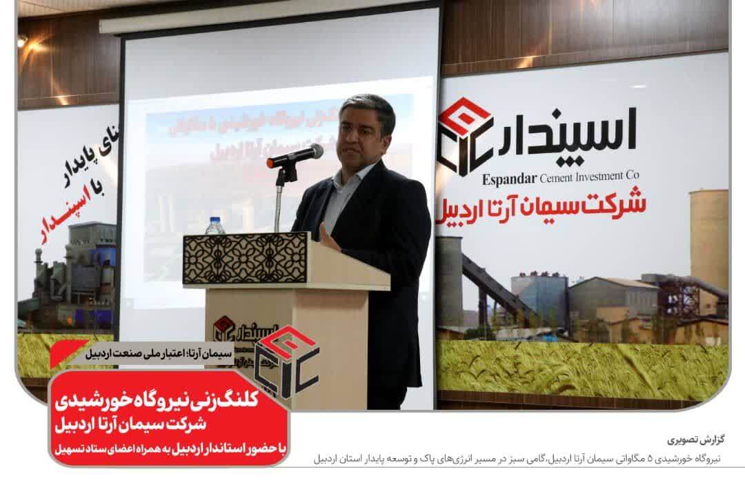 گفتنی است با حضور استاندار اردبیل فاز اول نیروگاه خورشیدی کارخانه سیمان آرتا با ظرفیت ۵ مگاوات، در زمینی به مساحت ۷ هکتار و با سرمایه گذاری ۳ میلیون دلار، کلنگ زنی شد.