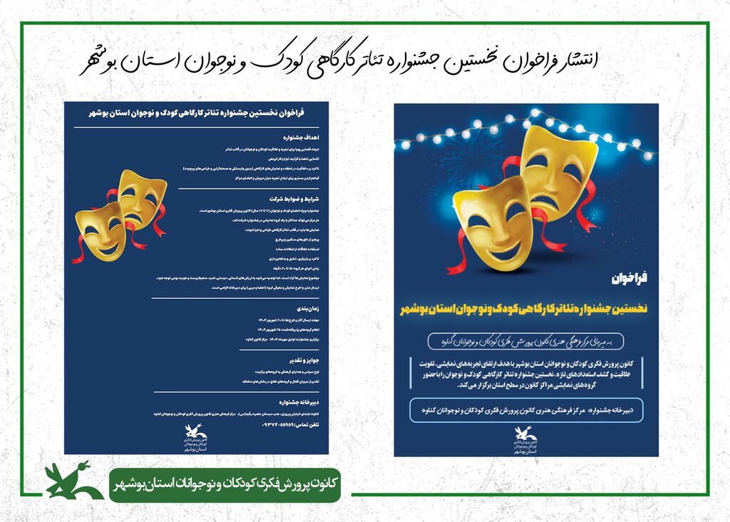 بهگزارش جام جم و به نقل از روابطعمومی ادارهکل کانون پرورش فکری کودکان و نوجوانان استان بوشهر، نخستین جشنواره تئاتر کارگاهی کانون پرورش فکری کودکان و نوجوانان استان بوشهر، با محوریت خلاقیتهای نمایشی کودکان و نوجوانان، در هفتهی اول آذرماه ۱۴۰۴ برگزار میشود.