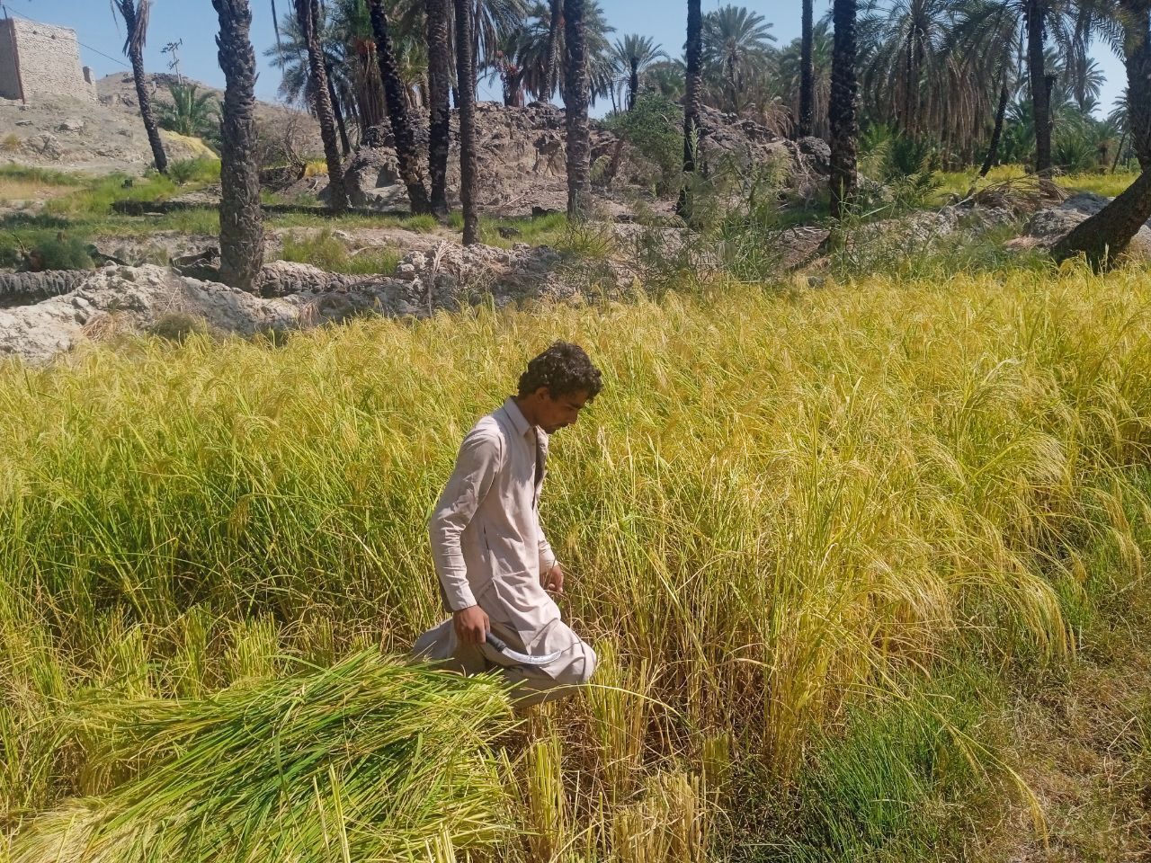 با رسیدن فصل برداشت، خوشه‌های برنج در شالیزار‌های حاشیه رودخانه دامن ایرانشهر می‌درخشند.