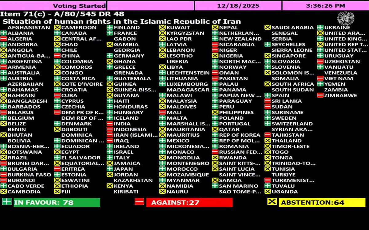 قطعنامه ضد ایرانی حقوق بشری کانادا سال گذشته (۱۴۰۳) نیز در مجمع عمومی سازمان ملل فقط ۸۰ رای موافق کسب کرد. این قطعنامه ۲۷ رای مخالف و ۶۸ رای ممتنع کسب کرد که در آن زمان نیز آرای مخالف و ممتنع بیش از موافقان آن بود.