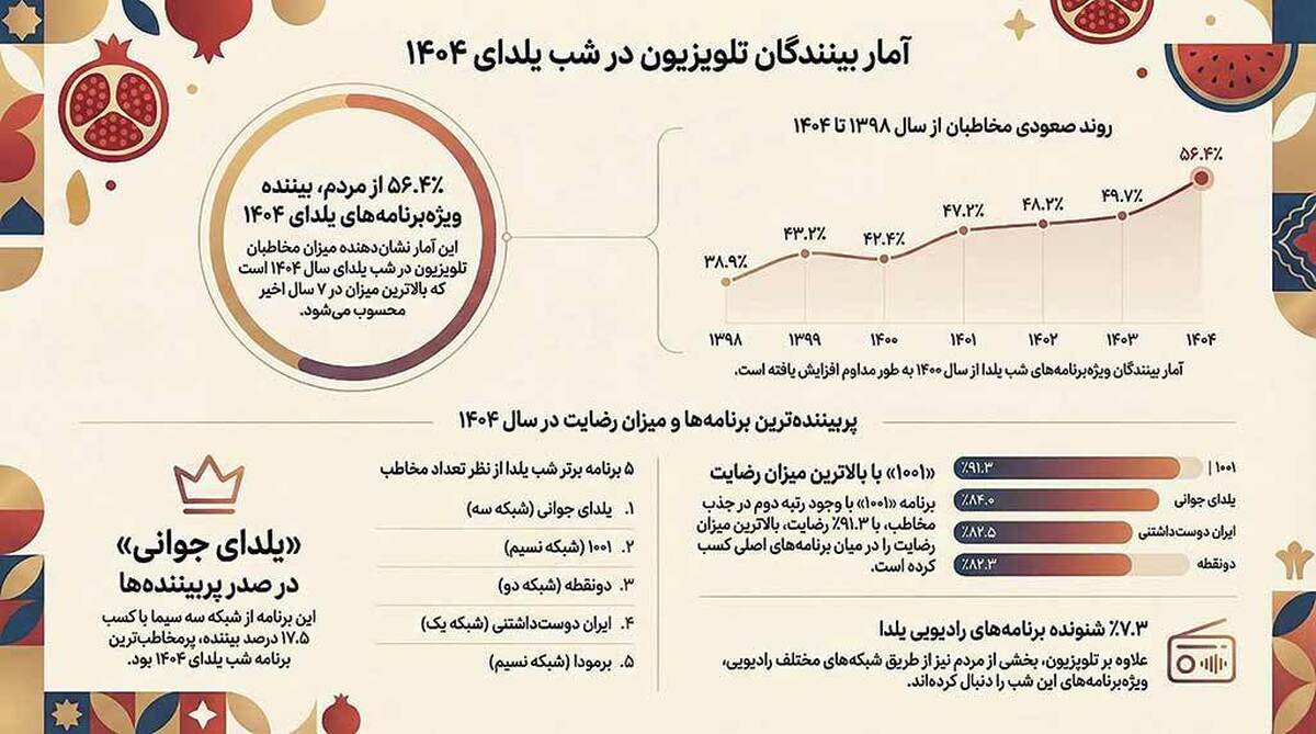مقایسه میزان مخاطبان ویژه‌برنامه‌های شب یلدا از سال ۱۳۹۸ تا ۱۴۰۴ مؤید آن است که این روند از سال ۱۴۰۰ تا ۱۴۰۴ دارای روند افزایشی بوده. این عدد در سال ۱۳۹۸، ۳۸.۹درصد، در سال۱۳۹۹، ۴۳.۲درصد، درسال۱۴۰۰، ۴۲.۴درصد، در سال۱۴۰۱، ۴۷.۲درصد، درسال۱۴۰۲، ۴۸.۲درصد، در سال ۱۴۰۳، ۴۹.۷درصد بوده است. این آمار امسال نیز روند صعودی را طی کرده و ۵۶.۴درصد پاسخگویان، ویژه‌برنامه‌های شب یلدای رسانه‌ملی را تماشا کرده‌اند. نتایج پیمایش اخیر نشان می‌دهد از میان برنامه‌های تدارک دیده شده در شبکه‌های مختلف،«یلدای جوانی»شبکه سه سیما با ۱۷.۵درصد بیننده در صدرایستاده‌است‌وپس ازآن برنامه‌های«۱۰۰۱»شبکه‌نسیم،«دونقطه»‌شبکه دو،«ایران دوست‌داشتنی»شبکه یک و «برمودا»ی شبکه نسیم قرار دارند.همچنین میزان رضایت از برنامه‌‌های «یلدای جوانی» ۸۴درصد، «۱۰۰۱» ۹۱.۳درصد، «دونقطه» ۸۲.۳ درصدو«ایران دوست‌داشتنی» ۸۲.۵درصد بوده است. مرکز تحقیقات صداوسیما اعلام کرده که ۷.۳درصد پاسخگویان شنونده ویژه‌برنامه‌های شب یلدا از شبکه‌های مختلف رادیویی بوده‌اند.