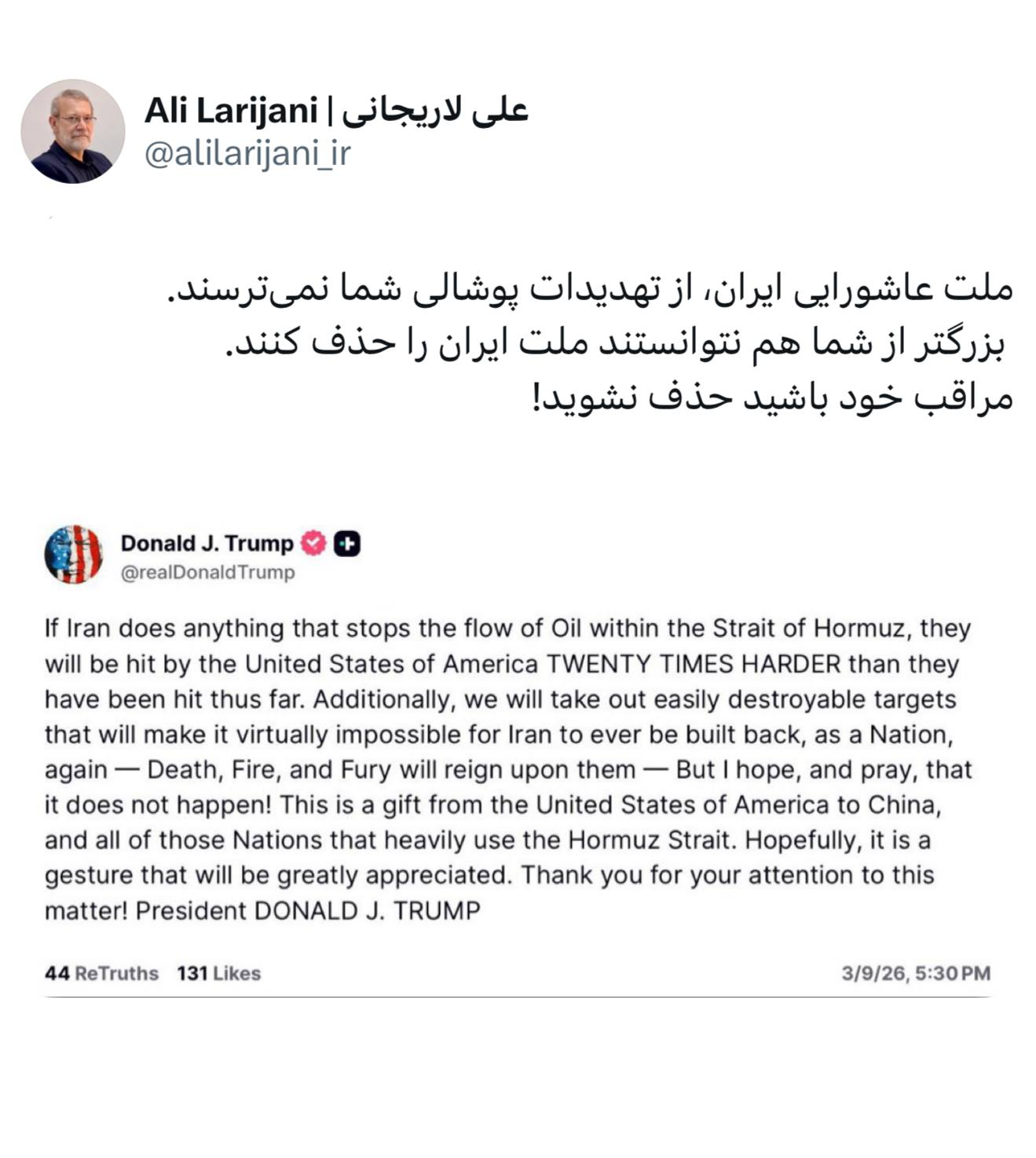 شایان ذکر است، دونالد ترامپ دوشنبه شب در پیامی ایران را تهدید کرد که اگر کاری انجام دهد جریان نفت در تنگه هرمز متوقف شود، ایالات متحده بیست برابر شدیدتر از آنچه تاکنون آن را مورد اصابت قرار داده، به آنها ضربه خواهد زد. علاوه بر این، ما اهدافی را که به راحتی قابل انهدام هستند، هدف قرار خواهیم داد که عملاً بازسازی ایران به عنوان یک ملت را غیرممکن خواهد کرد.