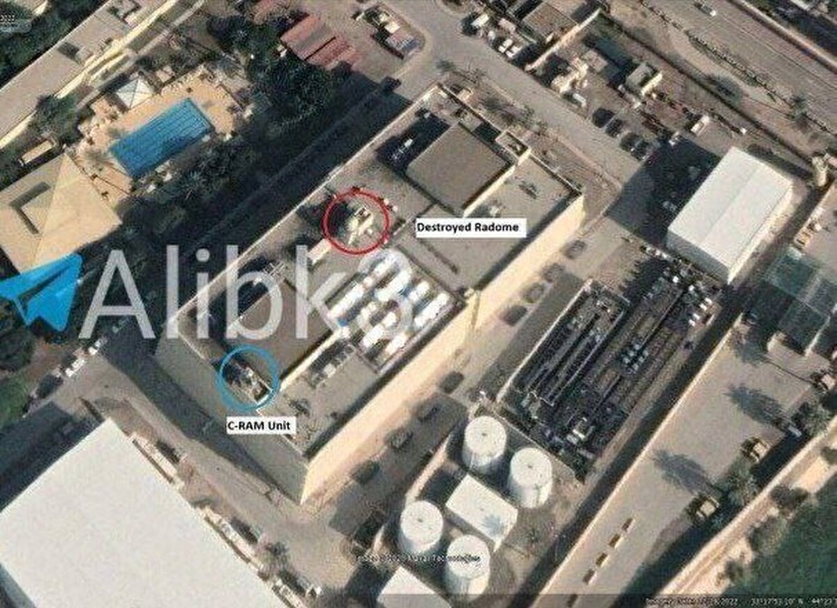 تصویر هوایی از محل استقرار آتش‌بار و رادار سامانه پدافندی سفارت آمریکا در بغداد که ساعتی پیش مهندم شد
