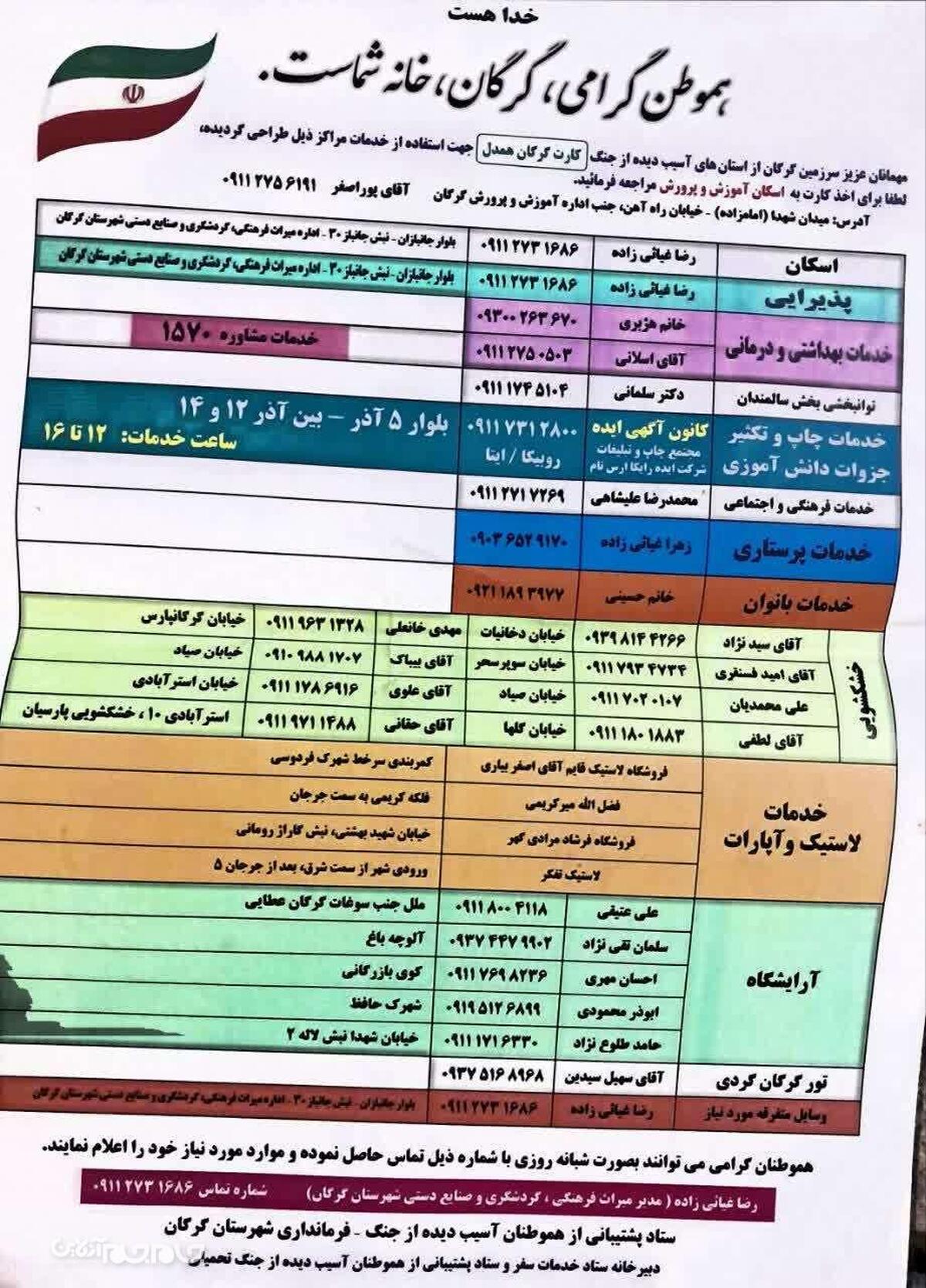 لازم به ذکر است در این قالب، فرمتی از خدمات را آماده کردهایم که در تمامی هفت مدرسهای که هموطنهای عزیز جنگزده در آنها اسکان دارند، نصب شده است تا هر امکاناتی که مورد نیاز باشد و آنچه در بضاعت ماست، در خدمتشان قرار گیرد. سایر موارد هم شماره تلفن و آدرس هر بخش اعلام شده تا عزیزان بتوانند بهصورت ۲۴ ساعته از خدمات بهرهمند شوند؛ اعم از پرستار، پزشک، روانشناس و مشاور، آرایشگاه، خشکشویی، آپاراتی، اسکان، پذیرایی و همه موارد. سعی کردهایم همه ملزومات را آماده کنیم و سایر موارد را نیز اعلام کردهایم تا در حد توان، خدمات متفرقه را هم فراهم کنیم.
