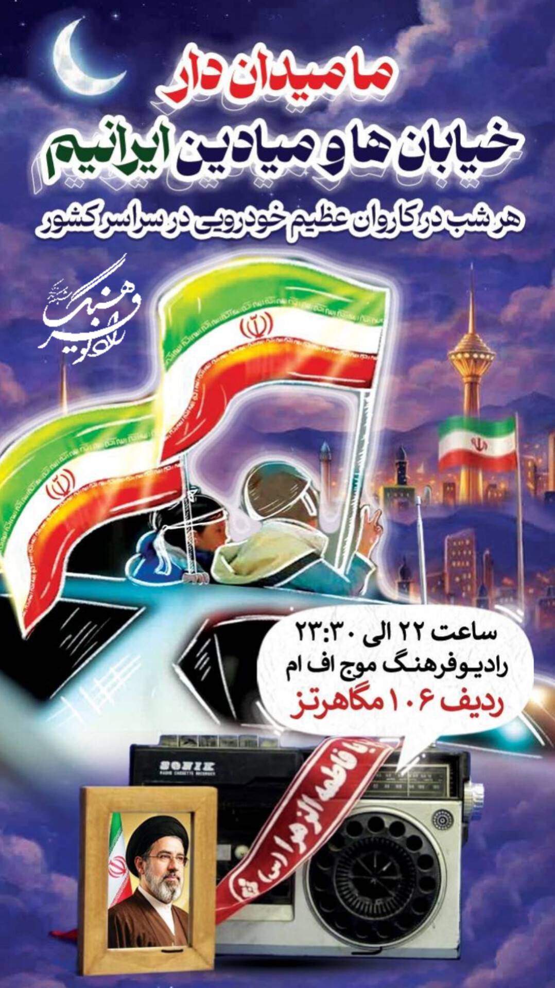 به گزارش جام جم آنلاین از روابط عمومی رادیو فرهنگ، «ما میداندار خیابانها و میادین ایرانیم» شعار این برنامه است و با این شعار، شنوندگان در سراسر ایران، شبانه در کاروان عظیم خودرویی خود، همراه با موج رادیو فرهنگ، پژواک صدای اقتدار و حماسه ایران خواهند بود. این برنامه، فرصتی است برای تجدید پیمان ملی و همدلی در دفاع از میهن اسلامی.