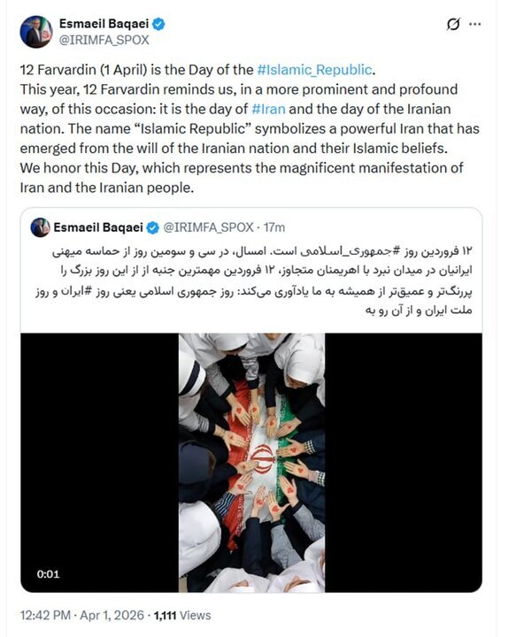 به گزارش جام جم آنلاین، اسماعیل بقایی سخنگوی وزارت امور خارجه در پیامی در شبکه ایکس به مناسبت فرارسیدن دوازدهم فروردین «روز جمهوری اسلامی ایران» نوشت: «۱۲ فروردین روز جمهوری اسلامی است. امسال، در سی و سومین روز از حماسه میهنی ایرانیان در میدان نبرد با اهریمنان متجاوز، ۱۲ فروردین مهمترین جنبه از این روز بزرگ را پررنگتر و عمیقتر از همیشه به ما یادآوری میکند: روز جمهوری اسلامی یعنی روز ایران و روز ملت ایران و از آن رو به روز «جمهوری اسلامی» موسوم شده است که ایران مقتدر محصول حضور و ایستادگی جمهور ایرانی و باور اسلامیاست.