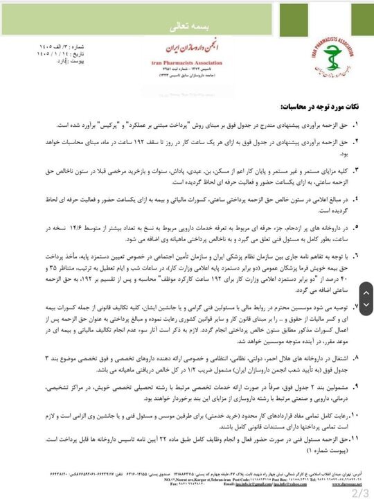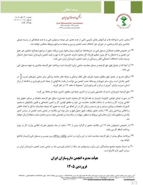 به گزارش جام جم آنلاین، در نامه هیئت مدیره انجمن داروسازان ایران آمده است: در سومین سال از اجرای مصوبه آخرین مجمع نمایندگان انجمن داروسازان ایران در خصوص یکسان سازی برآورد حق الزحمه های مسئولین فنی و داروسازان و در همفکری با سازمان نظام پزشکی؛ قرار شد ارزش گذاری نسبی خدمت همکاران داروساز در داروخانه ها، همتراز جامعه پزشکی انجام شود.