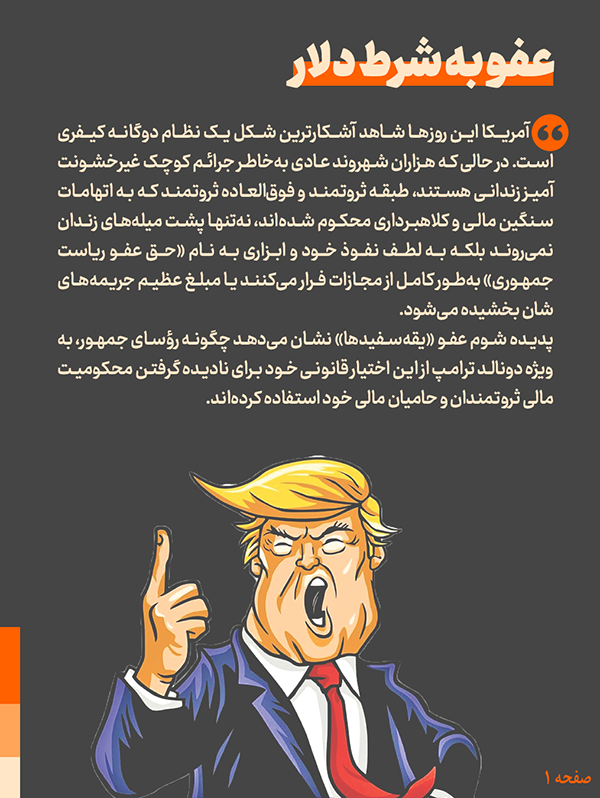 آمریکا این روز‌ها شاهد آشکارترین شکل یک نظام دوگانه کیفری است. در حالی که هزاران شهروند عادی به‌خاطر جرائم کوچک غیرخشونت‌آمیز زندانی هستند، طبقه ثروتمند و فوق العاده ثروتمند که به اتهامات سنگین مالی و کلاهبرداری محکوم شده‌اند، نه‌تنها پشت میله‌های زندان نمی‌روند بلکه به لطف نفوذ خود و ابزاری به نام «حق عفو ریاست‌جمهوری» به‌طور کامل از مجازات فرار می‌کنند یا مبلغ عظیم جریمه‌های‌شان بخشیده می‌شود.
